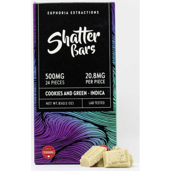 White Chocolate Cookies and Green Shatter Bars by Euphoria Extractions are indica-dominant chocolate bars 🍫 that combine the sweet taste of white chocolate 🤍🍫 with crunchy cookie pieces and high-quality cannabis extract 🌿. Each bar contains 24 squares 🍬, allowing for easy dosing 📏. Available in 250 mg, 500 mg, and 1200 mg THC options to suit various user needs 🌟💫.