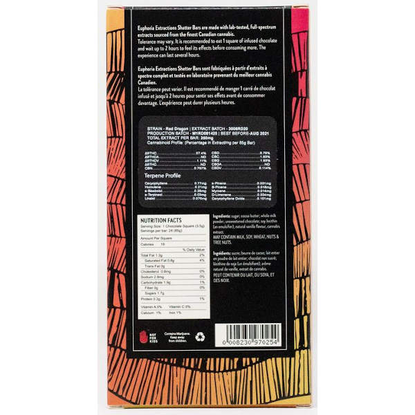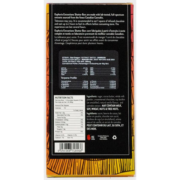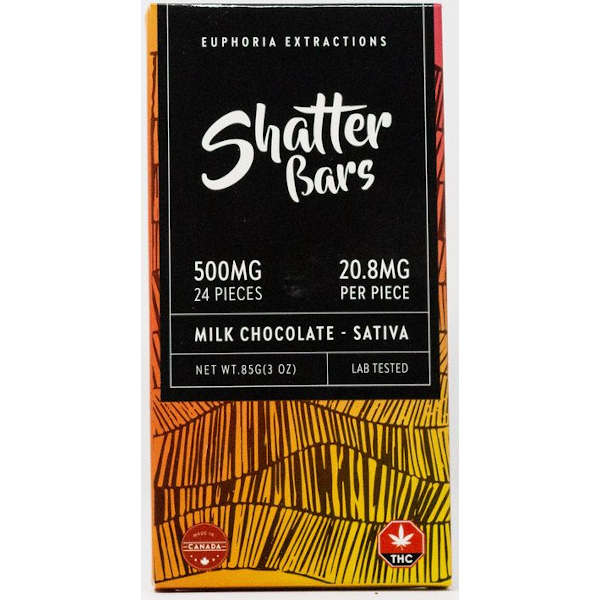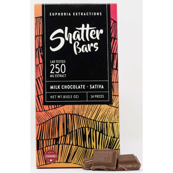 Milk Chocolate Shatter Bars by Euphoria Extractions are sativa-dominant chocolate bars 🍫, offering the creamy taste of milk chocolate 🥛🍫 infused with premium cannabis extract 🌿. Each bar contains 24 squares 🍬, allowing for easy dosing 📏. Available in 250 mg, 500 mg, and 1200 mg THC options, catering to various preferences 🌟💫.